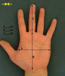 手が小さい・手の平が大きい・指が長いなどで大きさや長さのリクエストがあるお客様はA・B・Cサイズを入力、手形の写しはFAX(03-3677-7472)にて送信下さい。